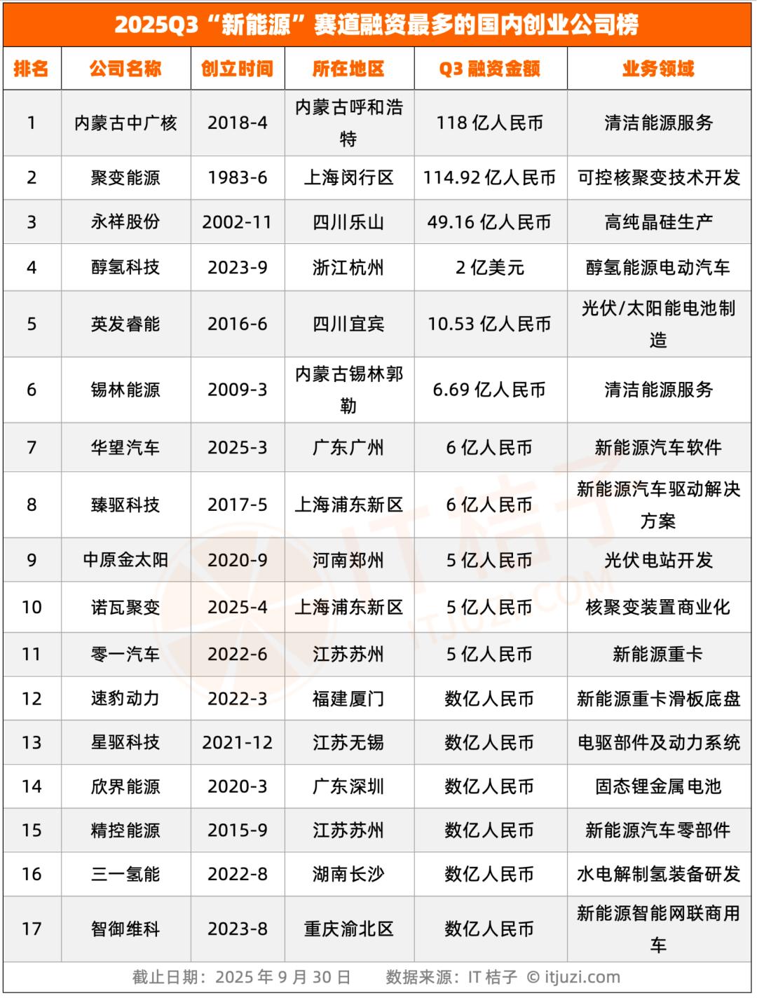 2025年三季度国内新能源赛道融资最多的创业企业中,以下特征比较显著——