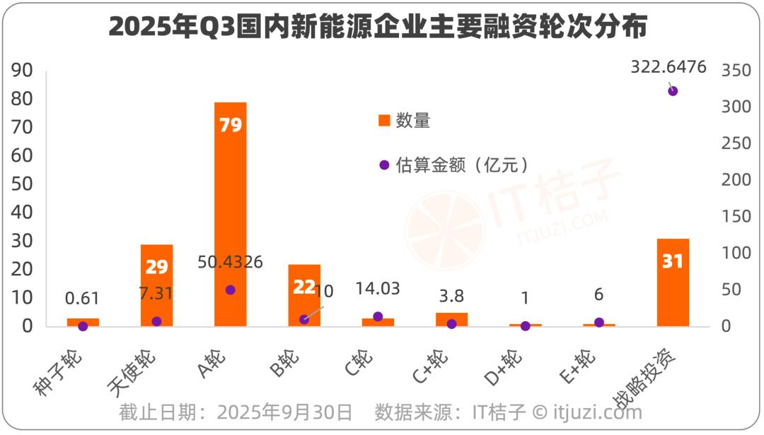 2025年三季度,新能源赛道各融资轮次的数量分布呈现“早期与成长期并重、战略投资活跃” 的特点。其中,A 轮融资以79笔成为当期最核心的融资轮次,战略投资有31笔紧随其后,同时天使轮有29笔。