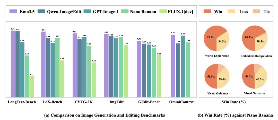 从测评成绩来看,悟界·Emu3.5的表现也极其亮眼——在多项权威基准上,性能媲美甚至超越了Gemini-2.5-Flash-Image,没错,就是那个Nano Banana,在文本渲染和多模态交错生成任务上优势尤其显著。