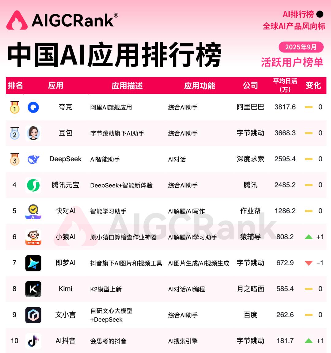 而不少评论常常会引用的AIGCRank《中国AI应用排行榜》,在9月夸克的平均日活数位列榜首,紧随其后的是豆包。其中有一个bug在于, 在夸克集成了“看资源”这一能力的大背景下,其不论日活或月活显然都有很大一部分并非是为AI而去,这显然也是一个无法忽视的现实。