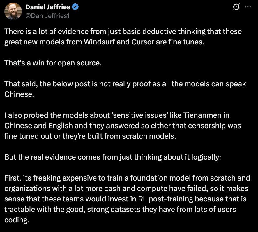 系统架构师 Daniel Jeffries 也发帖表示,有很多证据表明 WindSurf 和 Cursor 这些新模型都是经过微调,而不是从零开始训练的,这对于开源社区来说是一个胜利。