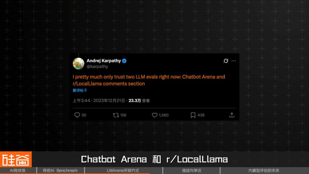 2023年12月底,前特斯拉AI总监、OpenAI早期成员Andrej Karpathy在X(推特)上发了一条关于LMArena 的推文,称“目前他只信任两个 LLM 评测方式:Chatbot Arena和r/LocalLlama”,给Chatbot ArenaI社区中收获到了第一批“流量”。