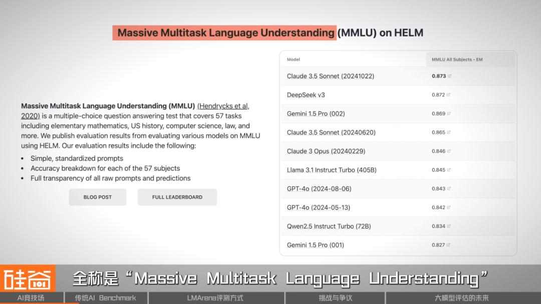 比如MMLU,全称是“Massive Multitask Language Understanding”,它涵盖了从高中到博士级别的57个知识领域,包括历史、医学、法律、数学、哲学等等,模型既需要回答像“神经网络中的梯度消失问题如何解决”的技术问题,也需要回答“美国宪法第十四修正案的核心内容是什么”的社会科学问题,学科跨度很大。