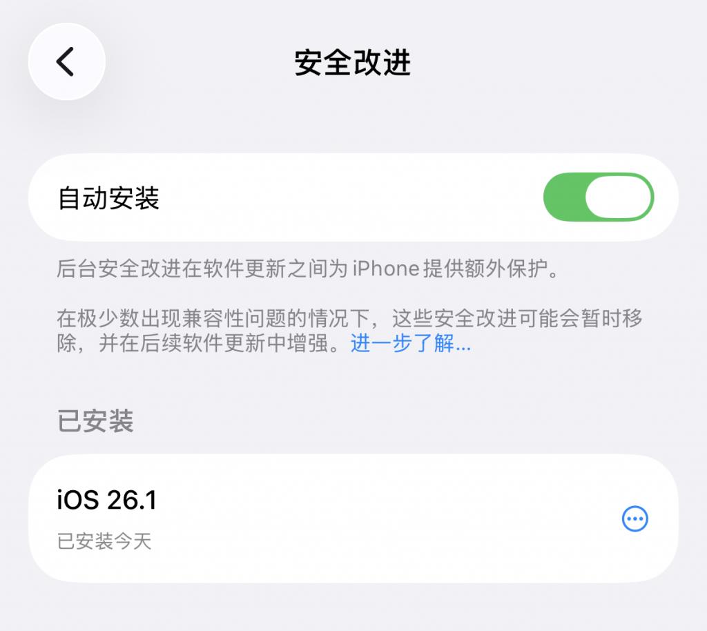 iOS 26.1 引入了一个新的安全更新设置,可以让 iPhone 自动下载和安装安全改进功能,有点像 Android 和 Windows 的「安全补丁」。