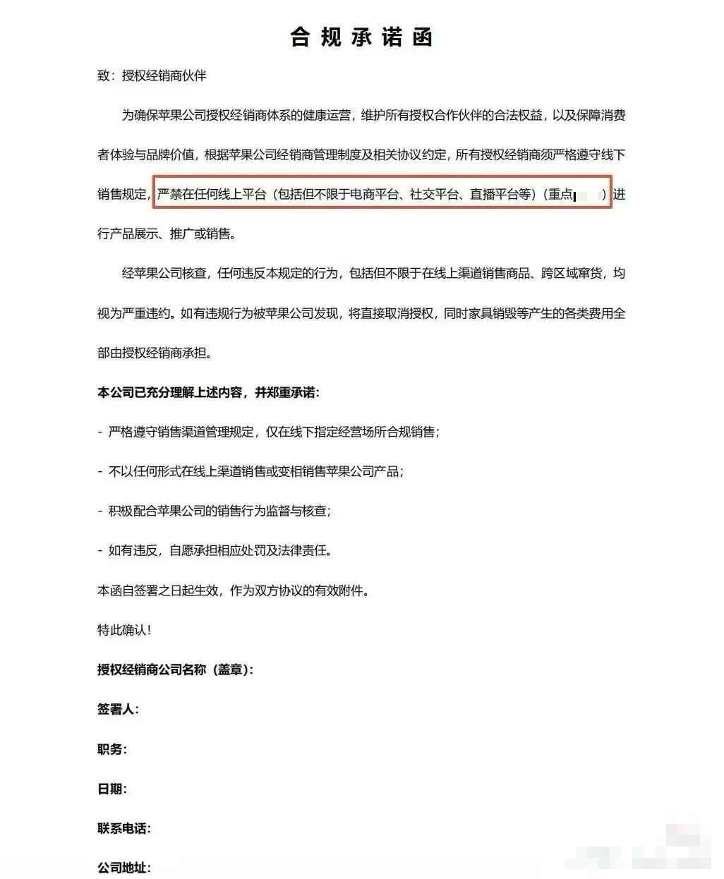 此外,网友还曝光了一份《合规承诺函》,要求苹果授权经销商承诺严格遵守销售渠道管理规定,仅在线下指定场所进行合规销售,不以任何形式在线上渠道销售或变相销售苹果产品,并积极配合苹果公司的销售行为监督与核查。