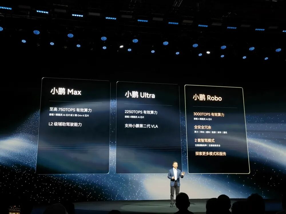 何小鹏表示,未来小鹏的车型将分为三个版本,分别是:L2级智驾能力的Max;拥有L4软件能力,但是还是L2硬件和法规的第二代VLA的Ultra;以及和Robotaxi同源,具备3000Tops有效算力,2套硬件系统安全冗余,以及2套智驾模式的小鹏Robo。