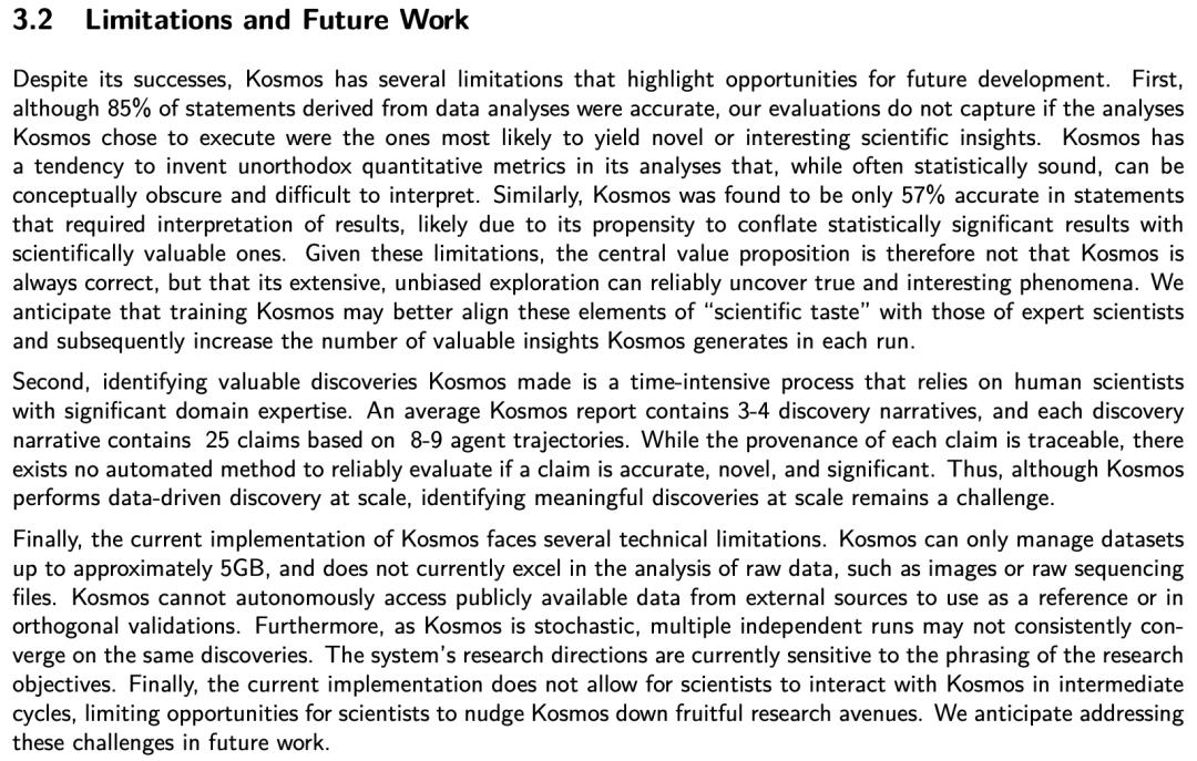 当然,称Kosmos为「AI科学家」也并不意味着它已经能够完全取代人类科学家的创造力与判断力。