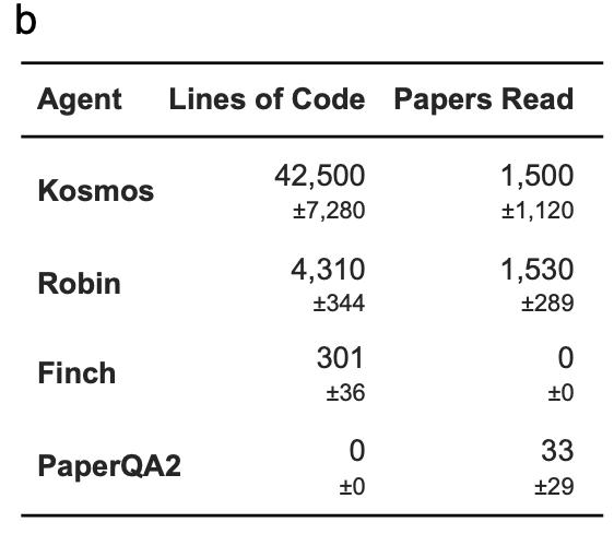 这一单次运行中,Kosmos平行执行了海量任务,总计阅读了约1500篇文献并执行了约42000行代码,几乎相当于一个科研团队半年的努力。