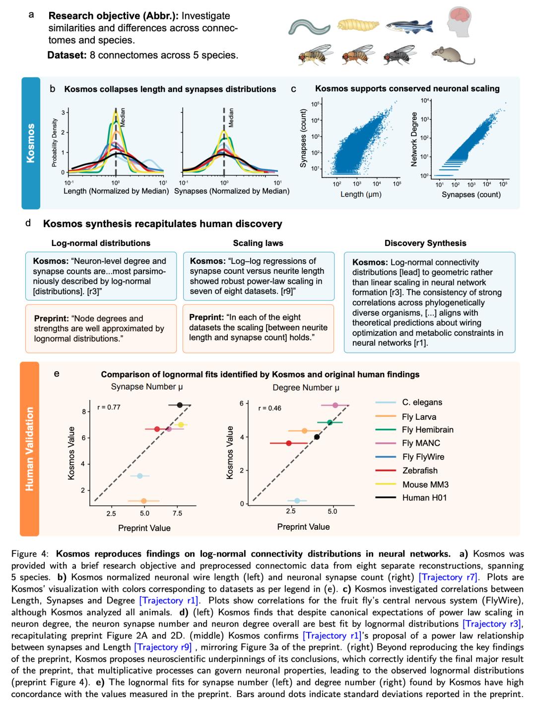 例如在脑连接组学研究中,Kosmos得出不同物种神经元连结数遵循对数正态分布的规律,并提出了可能的生成机制,这与人类此前的一篇预印本结论一致且更进一步;