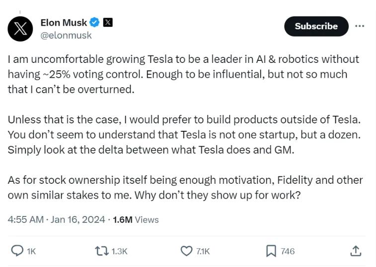 在2023年第四季度财报电话会议上,当被问及此事时,马斯克解释称,他已经看到了特斯拉成为人工智能与机器人巨头的清晰路径——一家拥有“真正巨大能力和力量”的公司。他并不想完全控制特斯拉,但希望拥有足够的影响力,以免在“激进股东”介入时被轻易罢免。