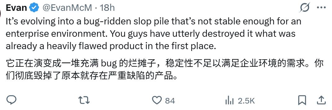 有网友甚至吐槽:“你们说系统在‘进化’,但它现在更像是一个充满 Bug 的垃圾堆。而现在,你们把这个本就有缺陷的产品,彻底给毁了。”