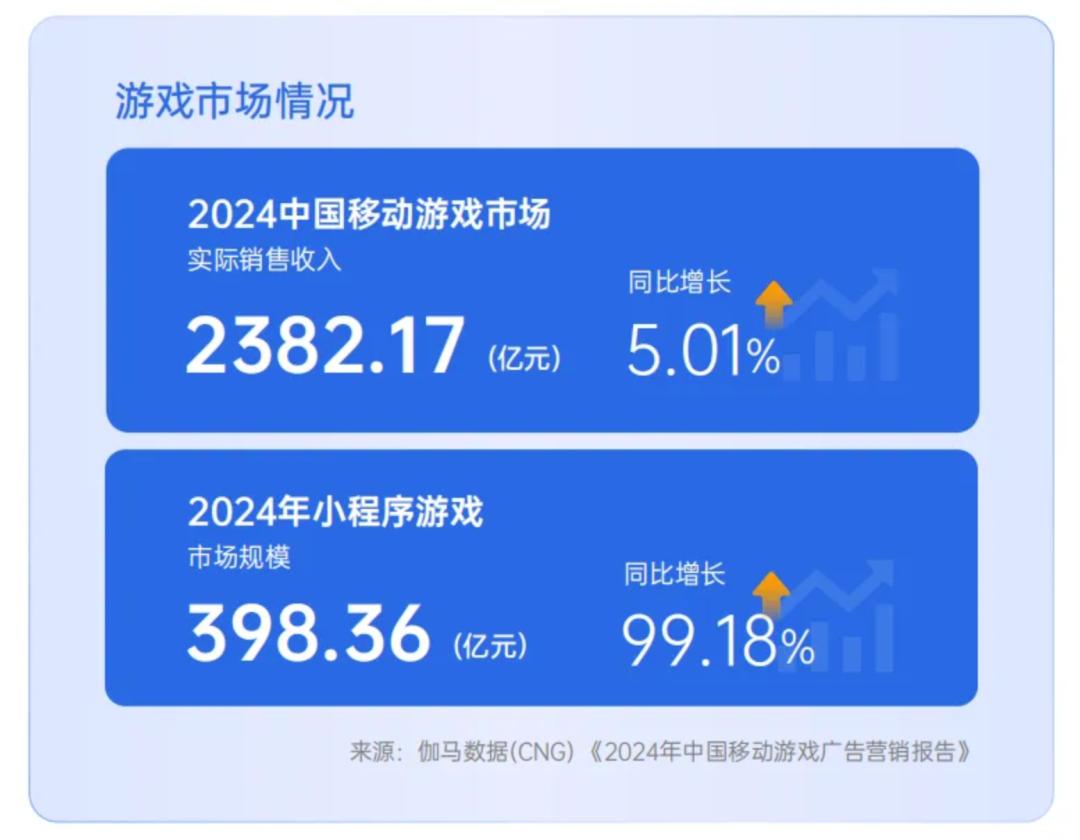 另一边,根据《2024 年中国移动游戏广告营销报告》,2024 年小程序游戏(即小游戏)市场总规模约 398.36 亿元,同比增长高达 99.18%,「小游戏市场收入已连续三年保持高速增长,其中内购收入占比也在逐年提升」。