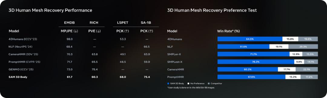 发布的基准结果显示,SAM 3D Body在多个三维人体基准测试中取得了显著优势,准确性和稳健性均领先于以往模型。