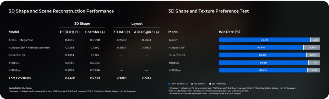 性能方面,SAM 3D Objects在一对一的人类偏好测试中,以5:1的优势战胜现有领先模型。同时,结合扩散捷径和优化算法,它能在几秒钟内完成全纹理3D重建,让几乎实时的三维应用成为可能,比如为机器人提供即时视觉感知。