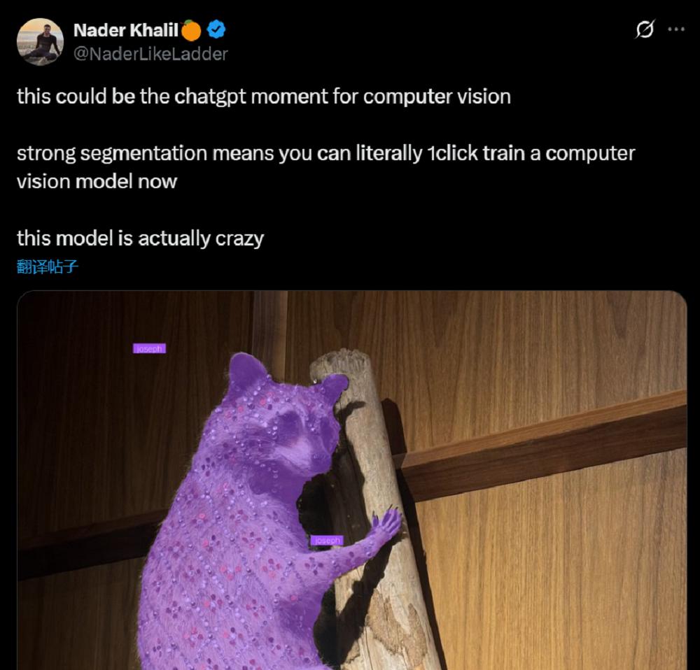 SAM 3的发布,让英伟达开发者技术总结Nader Khalil直呼:“这可能就是计算机视觉的ChatGPT时刻,强大的分割功能意味着用户只要点击一下就能训练计算机视觉模型,太疯狂了。”