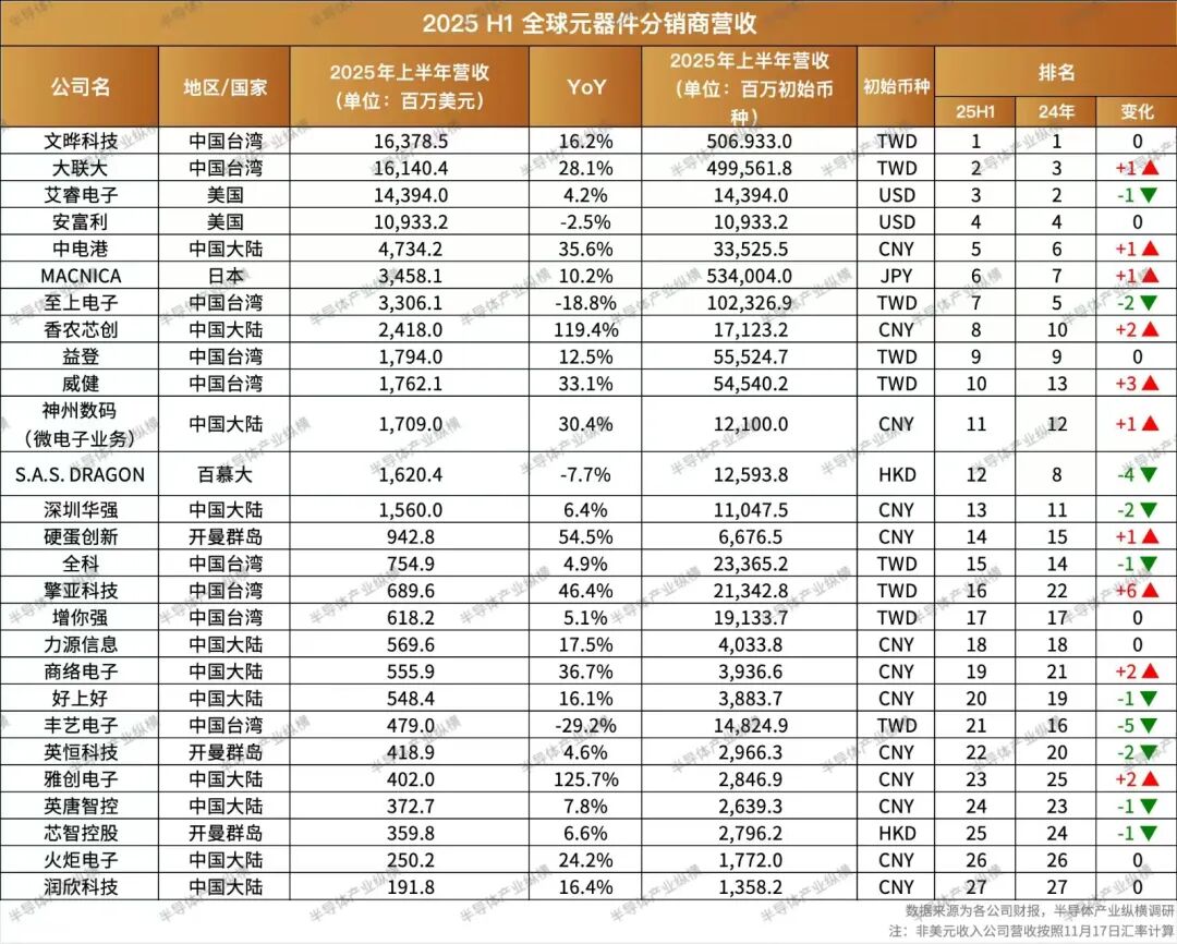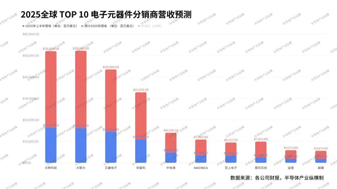 文晔科技依旧为全球最大的元器件分销商,但第二名有所变化。以2024年全年营收为参照,大联大在今年上半年以28.1%的增幅超过艾睿电子,晋升为全球元器件分销商第二位,与排名第一的文晔科技营收差距为2.4亿美元。中国台湾的分销商至上电子,在2025年上半年营收下滑18.8%跌出榜单前五,2024年营收排名第六的国内元器件分销公司中电港因此进入全球前五。