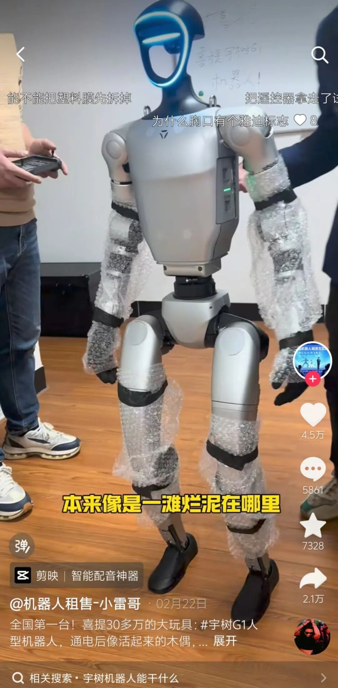 2月末,90后的小雷哥买下了人生中第一台机器人——价值30万元的高配版宇树G1。他随手拍下开箱视频:七十多斤的「铁疙瘩」竟自行站起,「像是木偶被注入了生命,从一滩烂泥变成通了电就能行走的钢铁战士」。