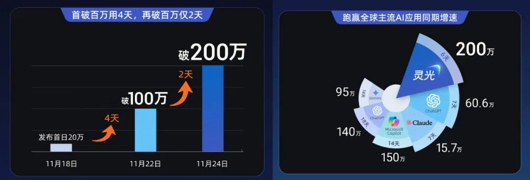 这一增速,超越了多款全球现象级AI应用,也远超灵光内部年底前下载量破20万的原计划。据移动应用分析机构Appfigures数据,ChatGPT上线首周下载量为60.6万,Sora2破百万用了5天,灵光将这一进程压缩至4天。