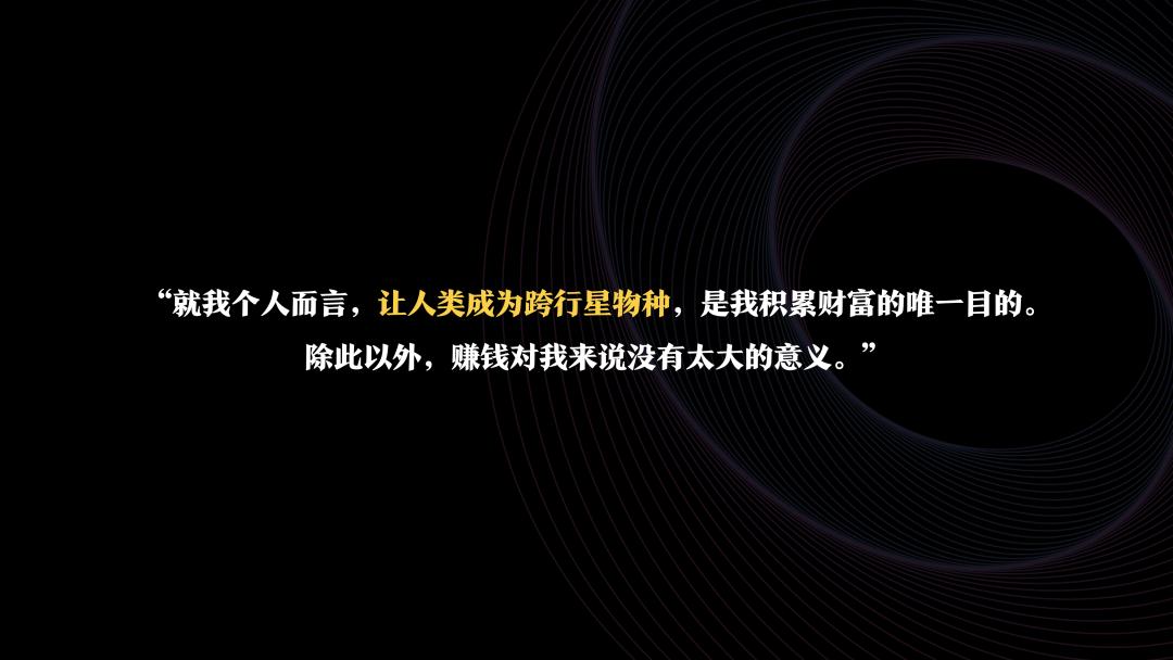 马斯克的新理念是超越商业,从生命尺度思考使命。他早期创业套现巨额财富后,回想起大学时改变人类未来的梦想,从“小我”走向“大我”。此外,他说过的一句话经常让我热泪盈眶:“对我而言,让人类成为跨行星的物种,这是我赚钱积累财富的唯一目的。除此以外,金钱对我没有任何意义。”