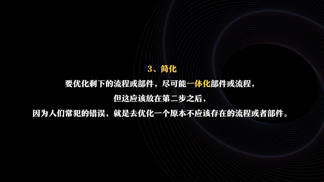 第三步是简化。要优化剩下的流程或部件,尽可能一体化部件或流程。以特斯拉为例,第一代两座跑车的电池放在后座。第二代四座车需将电池板放在车底,但电池板有厚度,若直接放置,车底易受损;若往上挪,车架变矮,车价上升。解决方法是将车底板与电池板一体化设计,车底板就是电池板,电池板就是车底板。