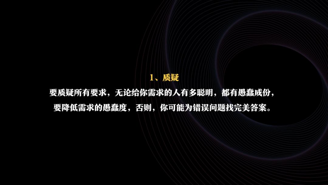 第一步是质疑。质疑一切,包括所有人对你的需求、要求,甚至这个题目本身。一个聪明人可能犯的最大错误就是去解一道根本不值得解的题。一定要记住,第一性原理的第一步是普遍质疑。马斯克如此大胆,甚至有些霸道。他甚至说,连我给你提的要求你也要质疑。