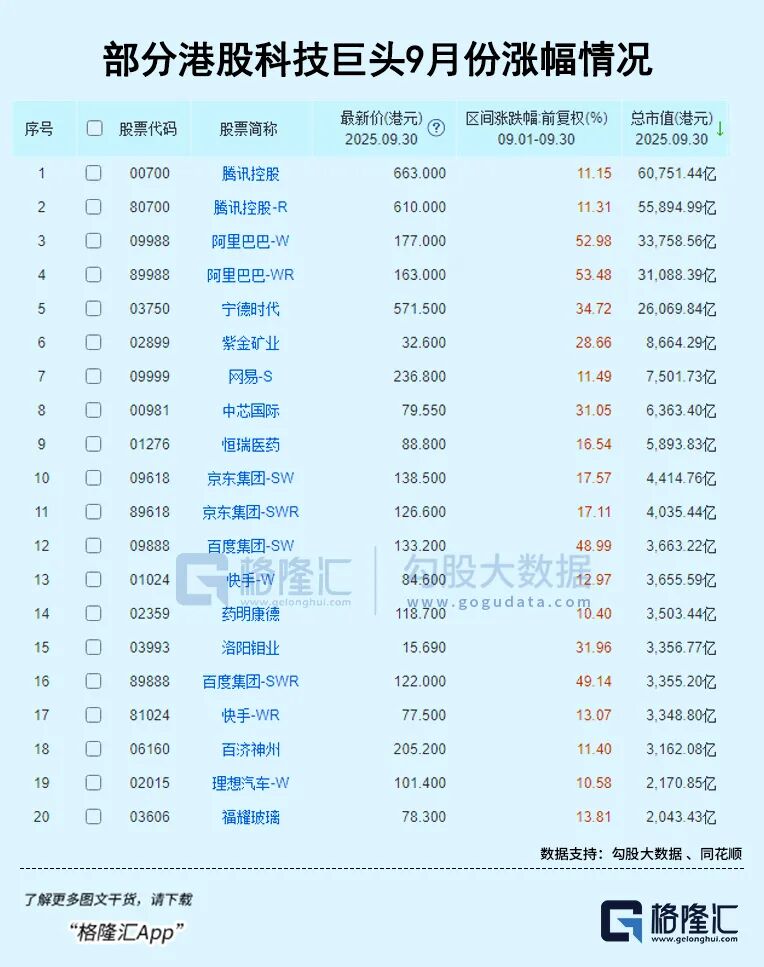 在港股,阿里无疑是9月份表现最亮眼的科技巨头,月内股价涨幅高达53%,市值增加了1.5万亿港元。股王腾讯月内也上涨了11.15%,最新市值突破至6万亿港元。另外还有宁德时代、中芯国际、百度等科技巨头月度涨幅也超过了30%。