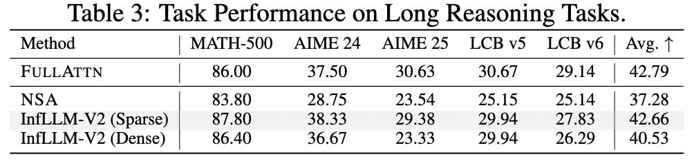 在数学、代码深思考任务中,InfLLM-V2能够实现与稠密注意力可比的性能,而 NSA 方法却对模型效果有着较大的损害。