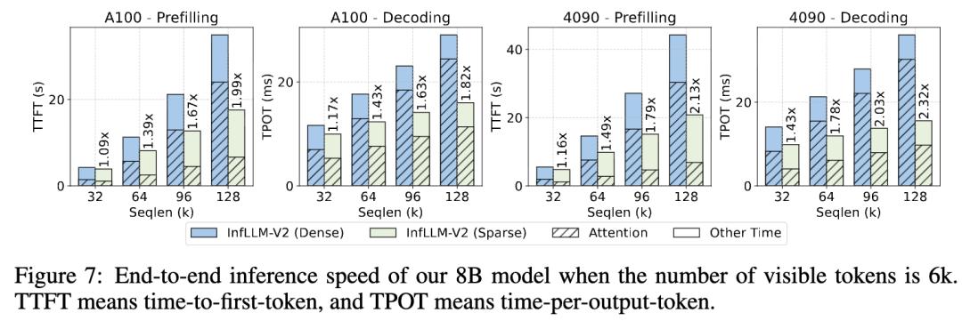 研究人员在A100与4090两款芯片上对InfLLM-V2进行了推理效率评测。