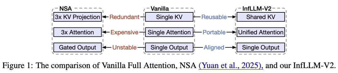针对上述痛点,InfLLM-V2 提出「零额外参数、长短无缝切换」 的可训练稀疏路径,在不改变原有注意力参数的前提下,完成从稠密到稀疏的平滑切换。