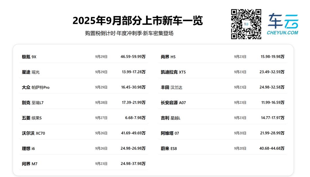 9月新车多,原本不是什么新鲜事,但今年确实有点格外疯狂了:方程豹钛7上旬上市,上市5天交付破千台;极狐T1身居纯电小车市场,上市1小时大定破2.6万;享界S9T以鸿蒙智行首款旅行车上市,后面跟着全新问界M7和被寄予厚望的尚界H5;奥迪E5 Sportback、领克10 EM-P、腾势N9、极氪9X也都陆续上市。
