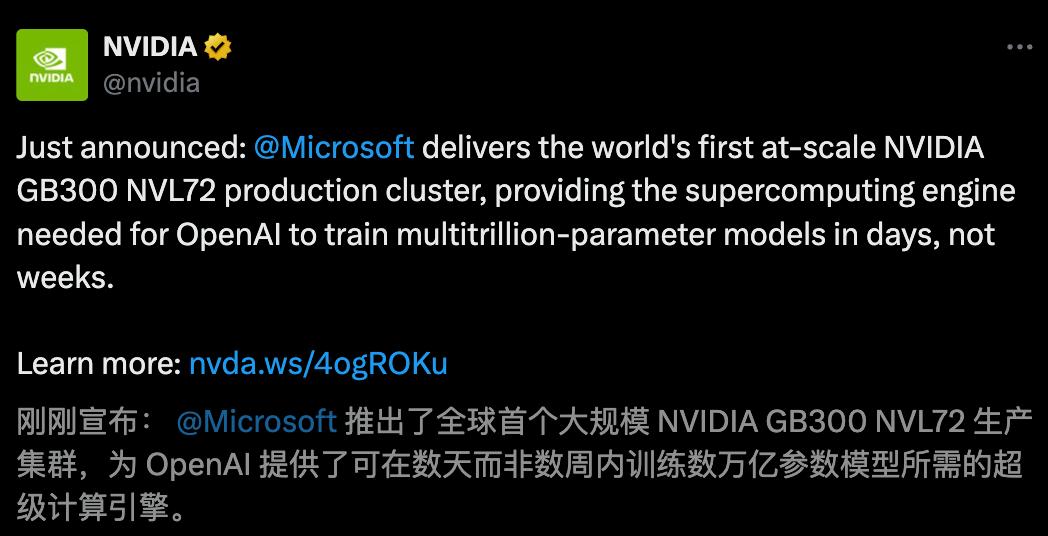 https://x.com/Azure/status/1976319720472138045 https://azure.microsoft.com/en-us/blog/microsoft-azure-delivers-the-first-large-scale-cluster-with-nvidia-gb300-nvl72-for-openai-workloads/